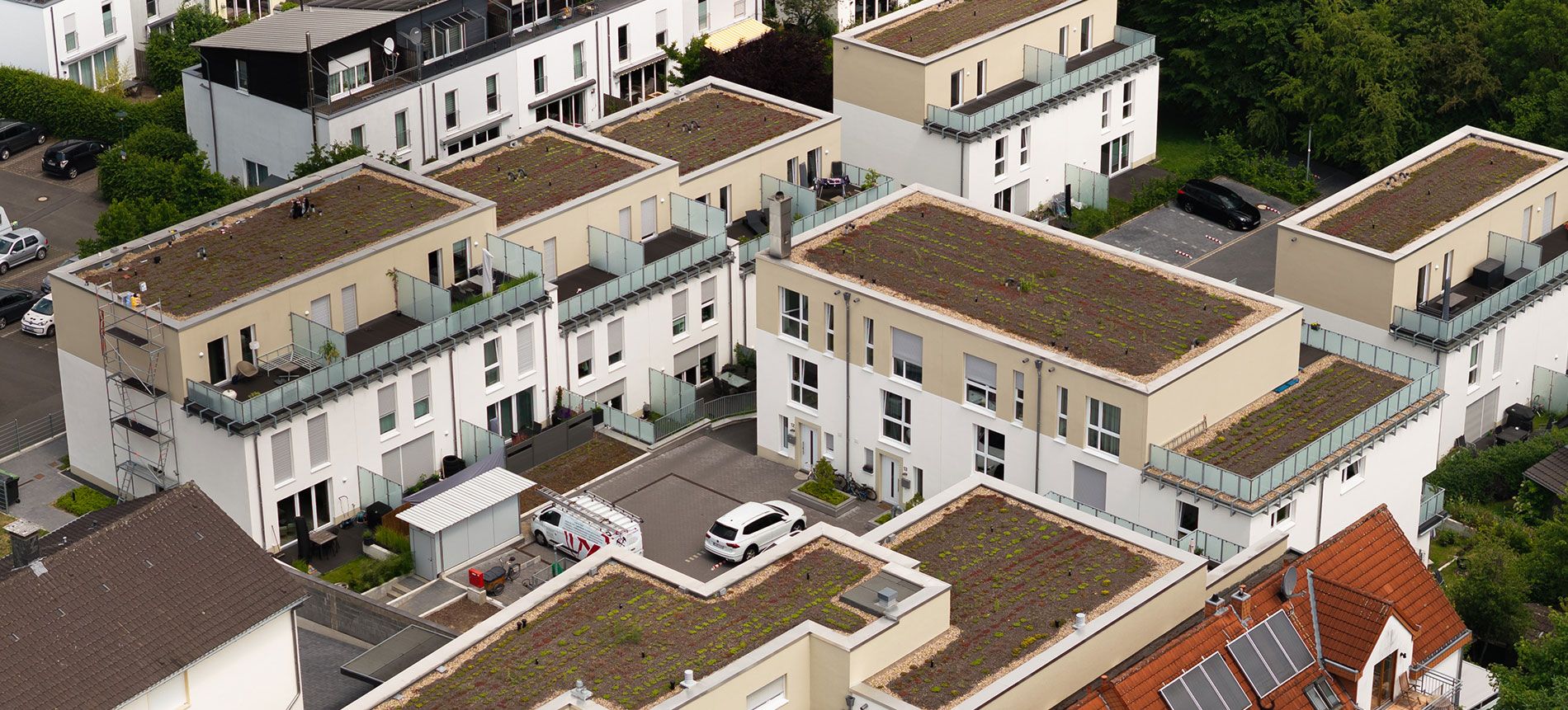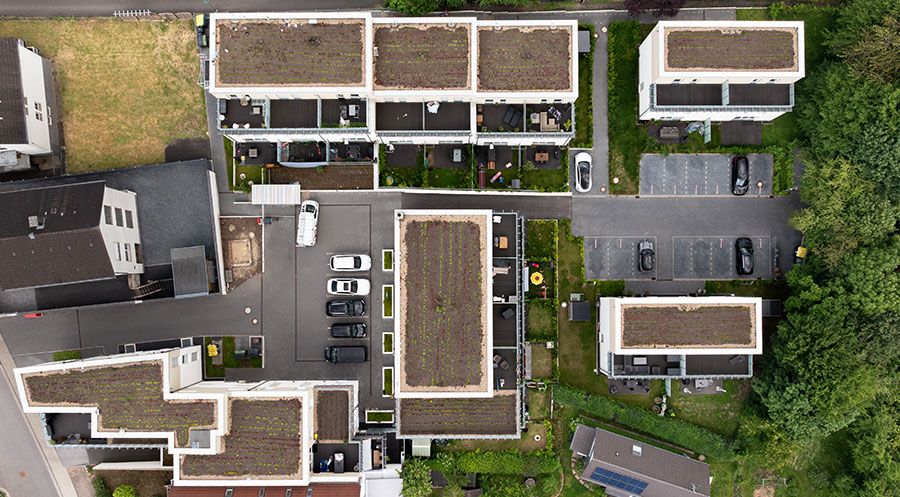 Das neue Quartier fügt sich harmonisch in die bergische Landschaft ein. Um das Nord-Süd-Gefälle von gut sechs Metern zu überwinden, wurden die Gebäude stufenförmig versetzt angeordnet. Die Zugänge zu den Häusern sind barrierefrei, das Mehrfamilienhaus ist mit einem Aufzug ausgestattet. Begrünte Flachdächer, eine Pelletheizung und moderne Wärmedämmung sind nur ein paar Beispiele für die intelligente Verbindung von zeitgemäßer Nachhaltigkeit und anspruchsvollem Wohnkomfort. Das Gebäude wurde im KfW-55-Standard errichtet.